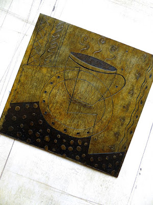 This one is a collagraph...a piece of mountboard with the design cut away, it's then coated with shellac to stop the ink being absorbed into the board